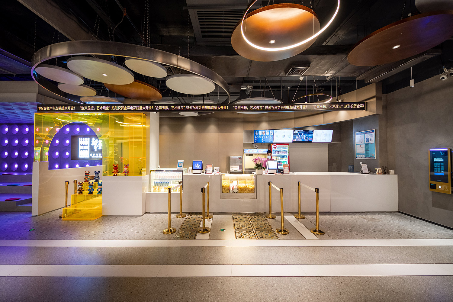 金聲電影院建成于1934年,舊址位于廣州西關(guān)老城區(qū)恩寧路,影院建成后,曾轟動(dòng)一時(shí),當(dāng)時(shí)戲院占地面積2千多平方米,曾稱為“全市影院中之最宏偉者”,是著名綜合娛樂場所。同時(shí)也是廣州第一家有冷氣的影院,坊間流傳:“人皆苦炎熱,我愛金聲涼”的名頭便是由此而來。“新金聲”的整體布局由“重現(xiàn)金聲”(影廳區(qū)域)“藝術(shù)金聲”(公共區(qū)域)“創(chuàng)意金聲”(大堂區(qū)域)三部分構(gòu)成。在籌備團(tuán)隊(duì)的精心策劃下,于影院內(nèi)陳列放置了金聲電影院舊址的騎樓裝飾,并將影院的7個(gè)影廳分別以7座大家耳熟能詳?shù)睦献痔?hào)影院命名,他們分別是:中華、樂善、明珠、新華、新星、長壽、美華。這一個(gè)個(gè)陪伴了廣州市民童年歲月的老字號(hào)影劇院,將以這種特殊的方式得以重生,在“新金聲”的懷抱中,用光影續(xù)寫新的篇章。在公共區(qū)域的裝修設(shè)計(jì)上,影院結(jié)合廣府文化元素,參考舊址外立面的建筑特色,利用現(xiàn)代設(shè)計(jì)手法,打造極具西關(guān)特色的電影藝術(shù)空間。為更好體現(xiàn)“人皆苦炎熱,唯有金聲涼”這一句曾家喻戶曉的美譽(yù),影院大堂通過玻璃、鏡面、亞克力等材質(zhì),使影迷在進(jìn)入瞬間開始便能感受到金聲電影院所帶來的歷史文化的厚重感。在公共區(qū)域,通過“策展+”的方式以“百年金聲”為常態(tài)展覽主題